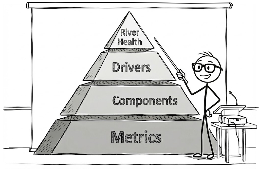River health assessments are performed to educate the breadth of stakeholders, whomever they may be. Results should aim to facilitate sustainable human development by informing river management decisions. Although developing management goals, objectives, strategies, processes, or actions for rivers goes beyond the bounds of the assessment itself, assessment results will play a foundational role in future management decisions and activities. CoRHAF simplifies the communication of complex river health assessment results by breaking down the riverine ecosystem into a discrete set of river health Drivers, Components, and Metrics. This structure, coupled with the use of straightforward grading rubrics, helps make river health assessment findings understandable and actionable.