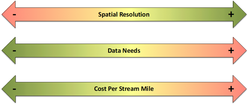 Scoping analytical intensity comes down to deciding how much study time and resources should be devoted to assessing a unit length of stream or area of the watershed for each of the Drivers. In CoRHAF, the different Drivers can be evaluated at different levels of intensity to allow you to dial in assessment rigor according to circumstances in the watershed, stakeholder interests, likely budget, and geographic extent.
